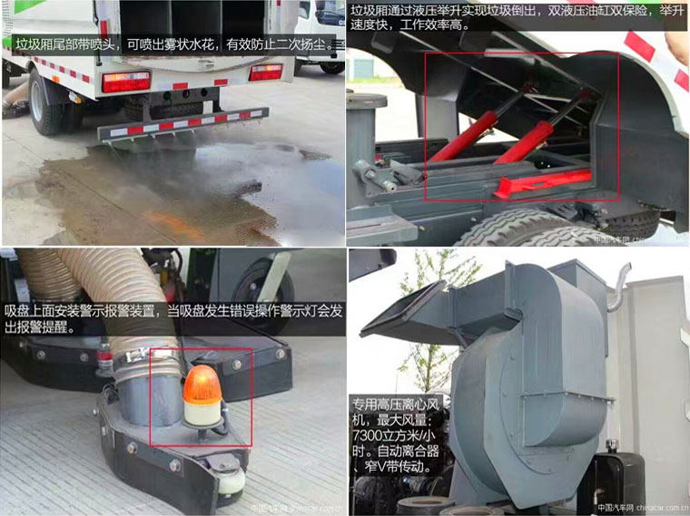 中置吸盘(干扫车带前2扫盘)、施耐德控制开关、海普瑞斯电磁阀组、无级变速自动离合器、免维护离心式风机、不锈钢垃圾箱、高精度垃圾箱过滤系统(最高可达0.3微米)、进口脉冲阀、尾部LED箭头灯、手动泵应急系统,车尾雾状喷水润湿功能。